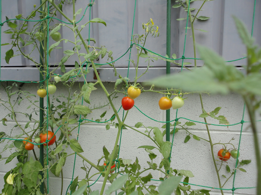 夏の太陽の下、トマトが少しずつ成長中。